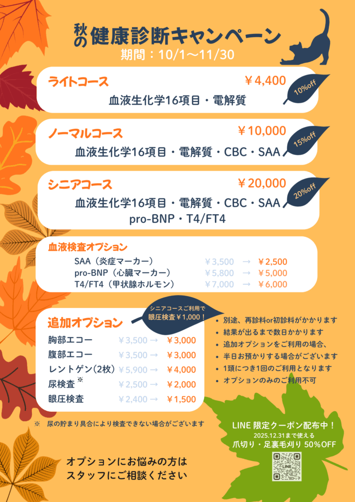 上石神井動物病院では10月1日(水)~11月30日(日)の期間、秋の健康診断キャンペーンを実施いたします。
