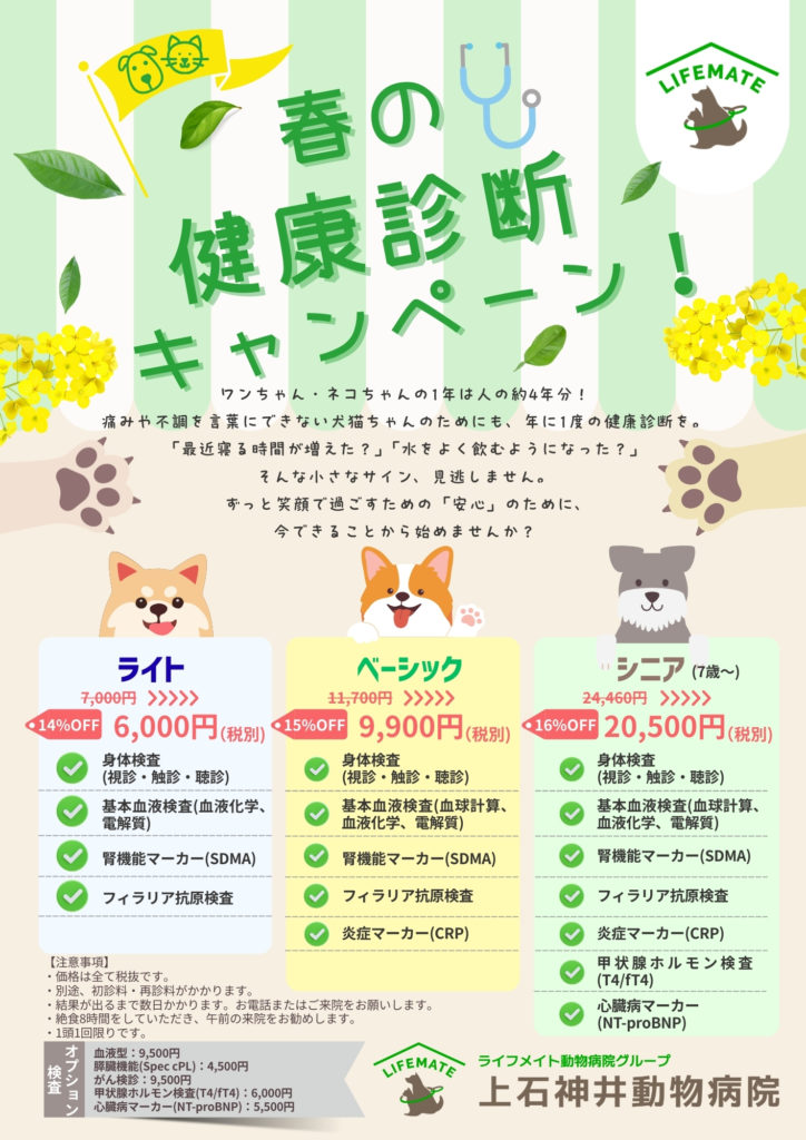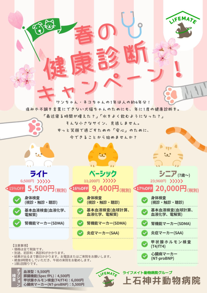 上石神井動物病院では4月1日~5月31日の期間、春の健康診断キャンペーンを実施いたします。